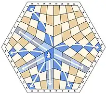 Par exemple, un fou placé en c3 pourrait aller en g11 en passant par les cases d4-e9-f10.