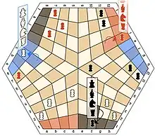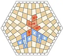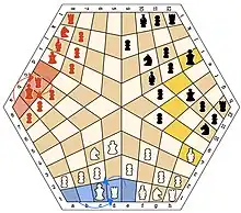 Les joueurs se positionnent de façon à avoir une case blanche sur leur droite, comme dans un jeu classique. Le placement des pièces est alors conforme au jeu d'échecs traditionnel à la différence près que la reine est toujours à la gauche du roi. La règle « reine sur sa propre couleur » n’est donc plus applicable (d'autant plus qu'il y a une reine rouge). On remarque qu'alors les trois rois sont toujours sur une case noire et les trois reines sur une case blanche.