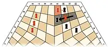 En l'absence de prise, nous remarquons que les quatre pions de droite sont destinés à faire leur promotion dans le camp adverse situé à leur droite et les quatre pions de gauche destinés à effectuer leur promotion dans celui de gauche. La destination de la promotion peut cependant changer si, au cours de sa marche, le pion prend un pion ou une pièce.