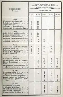 des classes spéciales établies dans les écoles d'enfants normaux »[24]. Elle aura pour conséquence, en 1909, la promulgation d'une loi créant des classes de perfectionnement pour ces enfants[25]. La commission décide en 1905 « qu'aucun enfant suspect d'arriération ne serait éliminé des écoles ordinaires et admis dans une école spéciale sans avoir subi un examen pédagogique et médical attestant que son état intellectuel le rend inapte à profiter, dans la mesure moyenne, de l'enseignement donné dans les écoles ordinaires » ; dès lors, la question est de donner une méthode rigoureuse aux « futures Commissions d'examen »[26] Dans ce but — celui de détecter l'inintelligence —, Binet et Simon publient en 1905 une « méthode de diagnostic du niveau intellectuel des anormaux »[27],[28]. Ils appellent « échelle métrique de l'intelligence » leur série d'épreuves :