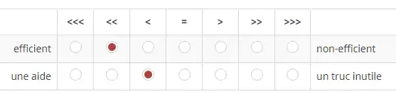 Contrairement à ce qui se pratique pour les échelles de Likert[4], il n'est pas conseillé de donner des libellés clairs aux points. On peut préférer à cet exemple numéroter les points de -3 à +3 mais ces valeurs peuvent conduire à des imprécisions dans la mesure[4].