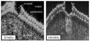 Cependant, il faut prendre en considération l'épaisseur de la peau qui est l'organe le plus épais du corps (par exemple, plus de 3 mm ne serait-ce que pour la couche dermique dorsale). L'échographie haute fréquence ne peut rendre visible que de faibles épaisseurs de peau (5-6 mm à 20 MHz, 3 mm à 75 MHz, 1 mm à 100 MHz). Cette limite peut s'avérer problématique dans la détection du cancer de la peau ou des anomalies vasculaires.