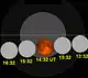 ![]() Schéma de l'évolution de l'éclipse, tandis que la Lune passe de droite (Ouest) à gauche (Est) dans l'ombre de la Terre. | |