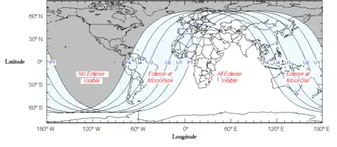 L'éclipse est totalement visible depuis l'Afrique et l'Asie centrale, visible au lever de Lune en Amérique du Sud, Afrique de l'Ouest et Europe, et visible au coucher en Asie orientale. Dans l'ouest de l'Asie, en Australie et aux Philippines, l'éclipse est visible juste avant le lever du soleil.