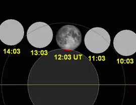 ![]() Schéma de l'évolution de l'éclipse, tandis que la Lune passe de droite (Ouest) à gauche (Est) dans l'ombre de la Terre. | |