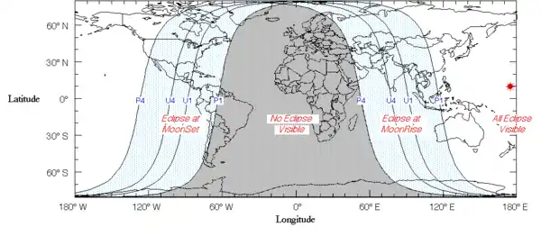 Cette éclipse était visible de l'Asie du Sud-Est, l'océan Pacifique, l'Australie et la Nouvelle-Zélande après le coucher du soleil, et dans l'Ouest de l'Amérique du Nord avant l'aube.