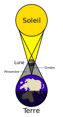 Le diagramme de droite montre l'alignement du Soleil, de la Terre et de la Lune pendant une éclipse solaire (les distances et les tailles respectives ne sont pas à l'échelle). La région gris foncé sous la Lune est l'ombre, où le Soleil est complètement obscurci. La petite zone où l'ombre touche la surface terrestre est l'endroit où une éclipse totale peut être observée. La plus grande région gris clair est la pénombre, dans laquelle seule une éclipse partielle peut être observée.