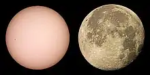 La distance entre le Soleil et la Terre est 390 fois plus grande que celle entre la Lune et la Terre. Le diamètre du Soleil est 400 fois plus grand que celui de la Lune. Puisque ces rapports sont approximativement les mêmes, les tailles apparentes depuis la Terre du Soleil et de la Lune sont approximativement identiques : ~0,5 degré (~30') d'arc angulaire. Parce que l'orbite de la Lune autour de la Terre est une ellipse, tout comme l'est l'orbite terrestre autour du Soleil, les tailles apparentes du Soleil et de la Lune varient.