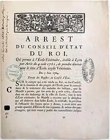 Un nouvel arrêté la renomme École royale vétérinaire en 1764. Elle est considérée comme la grande sœur de l'École d'Alfort fondée en 1765 par Bourgelat et Bertin.