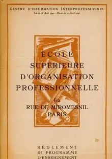 Ce comité est chargé d'organiser la profession par la profession et décide de créer une école proposant un enseignement complémentaire à ceux qui se destinent au syndicat patronal[7]puis, sous le régime de Vichy, aux dirigeants des comités d'organisation[8]et de l'Office central de répartition des produits industriels. En 1941, sous l'impulsion de Georges Lutfalla, cette école devient l'École Supérieure d'Organisation Professionnelle (ESOP) puis, en 1944, l'Ecole nationale d'organisation professionnelle.