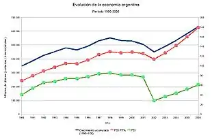En 2006, l'expansion économique a été de 8,5 %, ce qui constituait la quatrième année de croissance soutenue[35]. Selon les données officielles de la Banque centrale de la République argentine et l'Institut national de la statistique INDEC, en 2006 le produit intérieur brut en valeur nominale fut de 654.413 millions de pesos en prix courants[36], équivalent à 212.857 millions de dollars américains USD[37], avec un PIB par habitant de 6 548 dollars. Si l'on considère le PIB en parité de pouvoir d'achat (PPA), celui-ci atteint en 2006 quelque 621 070 millions de dollars[38].
