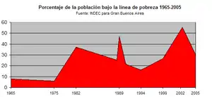 Le graphique (en rouge) affiché ci-contre montre les variations du taux de pauvreté survenues dans la mégapole du Grand Buenos Aires, au cours des dernières décennies. Jusqu'en 1975, ce taux était fort bas, moindre même que dans certains pays européens, largement inférieur à 10 %. Dès 1976, la proportion de pauvres commence à bondir à la suite des difficultés économiques du pays à la suite du choc pétrolier. La même année, les généraux prennent le pouvoir et c'est le début de la dictature argentine qui applique une politique monétariste dont le but est de substituer une production nationale aux importations. Dès lors, jusqu'à aujourd'hui (2007), le niveau élevé de la pauvreté ne se démentira plus, son apogée étant atteint en 2001-2002 avec plus de 50 % des habitants souffrant de la misère. À partir de 2002 cependant, à la suite des dévaluations et de la reprise économique subséquente, le taux de pauvreté s'est atténué, mais il reste encore très important, et un long chemin reste à faire pour atteindre le bas niveau du début des années 1970.