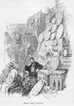 La dissolution du corps des janissaires, protecteurs traditionnels des guildes de Constantinople, en 1826, accélère le déclin de celles-ci. Au cours du XIXe siècle, le recul de l'artisanat urbain est à peu près général : à Ankara, le tissage de laine a pratiquement disparu ; à Bursa, le nombre de métiers à tisser la soie tombe d'un millier à 75. Les cotonnades européennes, surtout britanniques, représentent 80 % du marché à la fin du siècle; cependant, une industrie ottomane du coton commence à se développer au début du XXe siècle[28]. Le travail de l'artisanat rural, surtout féminin, prend plus d'importance que le travail des guildes urbaines à main-d'œuvre surtout masculine. Bien que le manque de capitaux entrave le développement industriel, des centres de production se développent à partir des années 1830 à Thessalonique, Edirne, dans l'ouest anatolien et au Liban. La soie brute et les tapis orientaux constituent les principaux articles d'exportation : ces deux industries emploient 100 000 personnes en 1914. La production de tapis, dans l'ouest de l'Anatolie, est un des rares succès à l'exportation[28]. La Régie co-intéressée des tabacs de l'empire ottoman, monopole public créé en 1881, est une des principales entreprises industrielles à la fin de l'époque impériale.