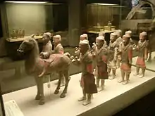 Les ateliers gouvernementaux des Han fabriquent des objets de luxe, des objets de la vie quotidienne et même des articles funéraires connus sous le terme de Mingqi (明器/冥器). Ces Mingqi incluent, entre autres, des figurines en céramique et des briques ou des tuiles servant à décorer les murs des tombeaux[78]. Ces ateliers sont sous la tutelle du Petit Trésorier (少府)[79].