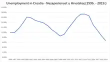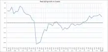 Le , la Croatie entre dans l'Union européenne après 10 ans de négociation[17]. L'adhésion de la Croatie n'est pas faite dans un contexte économique exubérant, le niveau de vie reste l'un des derniers de l'Union européenne devant la Roumanie et la Bulgarie, le pays reste en récession depuis le début de la crise économique. De plus l'adhésion induit l'arrêt d'un certain nombre de subventions tant pour l'agriculture, que pour les chantiers navals ou encore certaines entreprises publiques[18]. À partir de 2015, la Croatie connait à nouveau une période de croissance[4], entre 2,4 % et 3,5 % entre 2015 et 2019. Le chômage a baissé de manière importante à 6,8 %, avec cependant un taux d'activité faible[19]. Durant cette période, la Croatie connait un déficit budgétaire faible voir nul. Il en va de même pour l'inflation[19].