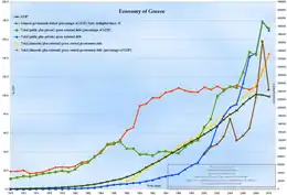 À partir des années 1950 et surtout 1960, le pays connaît un véritable essor économique sans précédent : le PIB passe de 4,5 milliards USD en 1960 à 56,8 milliards USD vingt ans après. Dans la décennie 1990 et surtout 2000 PIB augmente de manière spectaculaire : on passe de 97,89 milliards USD en 1990 à 354 milliards USD en 2008. La crise financière mondiale, accentuée par une crise de la dette publique grecque entraîne une période de récession économique majeure : le PIB passe de 354 milliards USD en 2008 à 299,4 milliards USD en 2010, 237 milliards USD en 2014 pour atteindre au plus fort de la crise 195,2 milliards USD en 2015. C'est la plus forte baisse jamais enregistrée dans l'histoire économique du pays. Les mesures d'austérité imposées entraînent une baisse du niveau de vie, l'explosion du taux de chômage et une vague de privatisations. En juin 2013, le gouvernement d'Antónis Samarás décide même de couper sine die et sans préavis la télévision et radio nationale, l'Ellinikí Radiofonía Tileórasi (ERT). Entre 2015 et 2018, le gouvernement d'Aléxis Tsípras évite au pays une sortie de la zone euro. Lorsque ce dernier quitte le pouvoir en juillet 2019, il laisse derrière lui un pays en meilleure forme qu'avant[réf. nécessaire] : la croissance remonte progressivement et lentement la pente pour passer de 195,6 milliards USD en 2016 à 203 milliards USD en 2017 et 218 milliards USD en 2018.