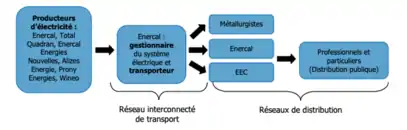 - Enercal, a été fondée en 1972 et gère le système électrique néo-calédonien, assurant l'équilibre entre la production et la consommation d'électricité, elle achète de l'électricité à différents producteurs et la livre aux métallurgistes et aux distributeurs.