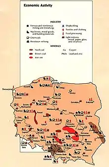 Le bassin houiller de la Haute-Silésie, notamment la conurbation de Katowice, est la grande région industrielle de Pologne, les charbonnages y sont associés à la sidérurgie et à la chimie. Les autres régions industrielles sont le centre portuaire de Gdańsk-Gdynia, la Basse-Silésie, la région de Łódź, de Cracovie et de Varsovie.