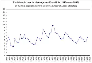 Les années 1970-1980 sont marqués par le choc pétrolier, la désindustrialisation et l'augmentation du chômage. Puis les États-Unis ont connu une période de croissance ininterrompue de près de 10 ans : de 1992 à 2000. Le Produit Intérieur Brut a crû de 3,7 % en moyenne au cours de ces années avec des pointes à 5,2 % en 2000 ou à 4,4 % en 1997 et 1998. Entre 1996 et 2000, le PNB a augmenté de 25 % : un taux de croissance économique comparable à celui des années 1960[21].
