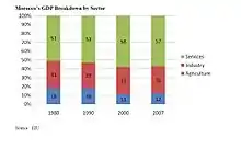 Le PIB du Maroc se répartit en 2010 entre: l'agriculture (17,1 %), l'industrie (31,6 %) et les services (51,4 %)[31],[32].