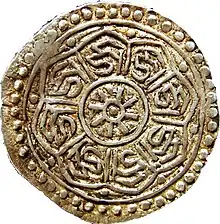 Comme les Népalais et les Chinois, les Tibétains n’utilisent pas l’or pour leur monnaie contrairement aux Européens. En 1650, le 5e dalaï-lama signe un traité avec le roi de Patan, Siddhi Narasimha Malla, autorisant le Népal à frapper la monnaie avec des lingots d’argent fournis par les Tibétains. Les rois Malla touchent alors une commission de 12 %. Cette monnaie a cours au Tibet, jusqu’en 1792, quand le gouvernement tibétain frappe sa propre monnaie[10].