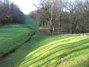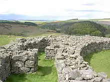 Cette ligne marquant la limite d'occupation de la Bretagne est consolidée en tant que limes (frontière de défense) de l'Empire par la construction du mur. Cet édifice est une fortification de pierre et de tourbe construite sur toute la largeur du nord de l'actuelle Angleterre. Il a une longueur de 80 milles romains (117 kilomètres)[51], sa largeur et sa hauteur dépendant des matériaux disponibles sur place. À l'est de l'Irthing, le mur est fait de blocs de pierre de 3 mètres de largeur sur 5 à 6 mètres de hauteur, alors qu'à l'ouest de la rivière, le mur ne contient que de la tourbe sur 6 mètres de large et 3,5 mètres de haut. Le mur est parfois grossi par l'ajout d'un fossé, d'un replat et de forts.