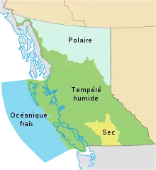 Dans le sud-est, l'air du Pacifique perd à nouveau son humidité lorsqu'il s'élève au-dessus des monts Columbia et des Rocheuses créant une zone d'humidité intérieure.