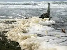 L’écume de mer est une mousse d'eau de mer provoquée par un vent violent qui recouvre temporairement des zones de l'estran, voire déborde jusqu'à quelques centaines de mètres sur le continent. Elle correspond à une dispersion de matière organique formée, au gré du roulement des vagues et du déferlement du vent, de bulles d'air et d'un biofilm composé d'algues, de plancton et de bactéries. La mousse formée par le brassage de l'eau est stabilisée par des tensioactifs issus de débris organiques provenant de pollutions ou de pullulations de certaines espèces planctoniques produisant des excrétats mucilagineux. Ces tensioactifs expliquent les moutons durables (crêtes mousseuses au sommet des vagues) ou les montagnes de mousse[1].