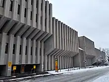 L'extérieur du bâtiment, tout en béton, est caractérisé par une enfilade de fenêtres en meurtrière[1].