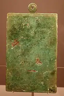 Le document est une plaque de bronze de forme rectangulaire portant en son sommet un cercle destiné à permettre de la suspendre. Elle mesure 24,4 × 15,3 × 0,2 cm. Les lettres ont une hauteur de 0,65 cm environ.