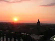 La base de la tour a une forme carrée, et le haut de la tour une forme octogonale. Toutes les deux tours sont recouvertes d’un chatior pointu d’une forme de pyramide octogonale. Quelques épitaphes en grès du style de renaissance et de baroque ont été encastrés dans les murs de l’église.