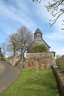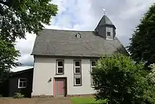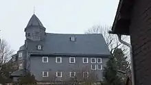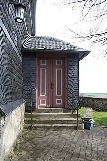 De petites lucarnes sont placées sur le haut toit à pignon en ardoise. Le coulisseau de toit, qui est également en ardoise, affleure le mur sud-ouest et a le cadran de l'horloge sur la pointe du pignon. La cloche octogonale à trous carrés est fermée par une hotte Welschen, couronnée d'une croix en fer forgé et d'une girouette[1]. Avant la Première Guerre mondiale, le Dachreiter abritait un anneau à deux cloches. Une cloche a été livrée à l'industrie de l'armement pendant la Première Guerre mondiale. Après la guerre, la communauté a lancé deux nouvelles cloches et a maintenant un anneau à trois anneaux[9]. Les deux grosses cloches ont fondu pendant la Seconde Guerre mondiale. La plus ancienne, datant de 1615 (300 kg, 0,78 mètre de diamètre) a échappé à la fonte et est revenue. Elle porte l'inscription "Anno MDCXV gos mich Melchior Balthasar Moeninck zu Erffurdt im Namen Gottes VDMIAE"[7].