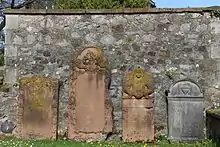 Dans le cimetière, quatre pierres tombales sont maçonnées dans le mur de la Schlossstraße au sud-ouest de l'église. Trois tombes en grès rouge datent de la période baroque. La grande épitaphe rectangulaire de gauche de 1705 a un grand champ d'écriture, qui est fermé sur les côtés par des guirlandes de fleurs et d'arcs et au sommet d'acanthes et de volutes. Dans la pierre tombale du milieu de 1741, un blason peut être vu sous une arche ronde, qui est tenue par deux anges. Le bloc de titre est encadré de fleurs et de vrilles. La troisième épitaphe de Johannes Zisler (1602-1664), Schultheiß zu Königsberg, montre le défunt en demi-figure sur deux champs d'inscription. La pierre tombale grise de Wilhelm Ernst Fri(e)drich Schulz (1737-1814), conseiller du gouvernement grand-ducal de Hesse et huissier de justice à Königsberg, avec une urne sous l'arche du couronnement, est caractérisée par le classicisme[1].