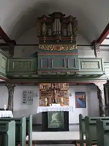 Une galerie en bois à trois côtés est construite dans l'église, qui ne prend que la moitié du côté sud pour laisser l'espace devant la chaire. Des poteaux octogonaux en bois avec des arcs soutiennent deux poutres longitudinales et incluent la galerie. La galerie a des remplissages rectangulaires, qui sont peints de fleurs et de vrilles stylisées. Les peintures parapet datent des années 1760[8]. La galerie d'orgue à l'est est similaire, mais les détails sont différents. L'intérieur est fermé au milieu par un tonneau en bois semi-circulaire, tandis qu'un plafond à poutre plate est dessiné au-dessus des galeries, les espaces entre eux sont plâtrés.