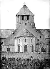 L'abside est éclairée par 3 groupes de deux baies superposées, toutes en plein cintre[B 5]. Des colonnes engagées entre les baies font office de contreforts extérieurs, disposition rarement retenue[14],[B 6].