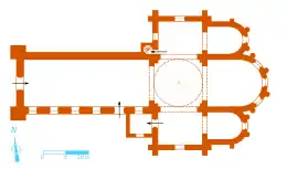 - Cette disposition peut préserver l'église des vents froids dominants du nord, mais elle peut aussi signifier l'ouverture de l'édifice à l'espace laïc au sud et son détachement de l'espace monastique au nord[11].