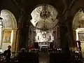 Une nef unique de style baroque est rythmée par des chapelles latérales. Elle possède un riche décor intérieur.