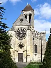 La façade occidentale laisse clairement apparaître l'organisation interne de l'édifice en trois vaisseaux, dont le vaisseau central domine largement les autres et est seul à posséder un pignon complet. Les demi-pignons des bas-côtés ne font qu'un avec les murs occidentaux des bas-côtés, et indiquent que les vaisseaux secondaires sont munis de toits en appentis. La façade est rythmée verticalement par la tourelle d'escalier octogonale de la nef, à gauche, et un contrefort strictement vertical, à droite. Ce type de contrefort à la fois large, saillant et vertical ne correspond à aucun type caractérisé (sauf les contreforts romans des bases de clocher), et semble s'expliquer par un souci d'harmonie avec la tourelle d'escalier. Celui-ci est couvert d'une brève pyramide en pierre, et non une flèche qui poursuit le plan octogonale de la tourelle, comme c'est habituellement le cas. Le pignon de la nef est sommé d'une croix nimbée en antéfixe, et ajouré d'une rosace hexalobe simple, entourée d'un cordon de têtes de clou. Cette rosace n'éclaire que les combles. La grande rosace de la nef est quant à elle cernée d'un rang de fleurs de violette dont les interstices entre les pétales sont fortement excavés. Ce motif souvent confondu avec les étoiles fait déjà partie du vocabulaire décoratif roman de la région. Autour de l'archivolte du portail, apparaissent de nouveau les têtes de clou. L'on remarque la forme surhaussée de cette double archivolte torique en tiers-point, qui provient de la situation assez basse du linteau. Un bandeau mouluré au-dessus du linteau délimite inférieurement le tympan ajouré d'une autre rosace hexalobe, et sert de même temps de tailloir aux chapiteaux de crochets des deux paires de colonnettes qui flanquent la porte.