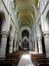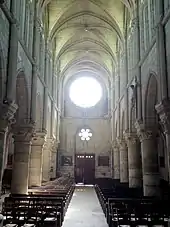 La nef, assez spacieuse grâce à ses six travées, n'est pas particulièrement lumineuse, mais les petites fenêtres hautes en liaison avec les colonnettes et moulurations, mettent en place un savant jeu de l'ombre et de la lumière. Ce n'est qu'en fin de journée que la nef est inondée de lumière et les deux élévations sont éclairées pareillement, quand le soleil entre par la grande rosace du mur occidental. Son remplage en délit décrit douze lobes, qui se terminent par des têtes tréflées, et les écoinçons sont ajourés. Au pied de la rosace, une coursière relie les combles des deux bas-côtés ; desservie par la tourelle d'escalier à gauche de la façade, elle rachète la profondeur du portail. Les voûtes sont toutes établies sur des croisées d'ogives simples. Les clés de voûte ne sont pas (ou plus) décorées, et leur orifice est mis à profit pour l'éclairage électrique. ogives et doubleaux ont exactement le même profil, qui est formé par un onglet entre deux tores sur un bandeau chanfreiné, qui ne s'aperçoit pas en regardant de face. Les élévations latérales de la nef sont harmonieuses et raffinées dans le traitement des surfaces murales. Elles suggèrent une élévation à trois étages avec un triforium, mais les murs au-dessus des grandes arcades vers les bas-côtés sont seulement décorés d'arcatures plaquées, telles que parfois employées pour rompre la monotonie des soubassements des fenêtres[7].