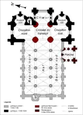 | Autres campagnes de travaux | fin XVe siècle (reprise de la croisée du transept) ; milieu XVIe siècle (porche) | ||