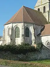 En dépit du changement d'aspect très important entraîné par le revoûtement, quelques éléments du XIIIe siècle restent toujours en place. Ce sont, tout d'abord, les fenêtres à lancette simple de l'abside, dont celle du nord est entièrement bouchée, et les autres, à 40 %. Au sud, la première travée est également éclairée par une lancette simple. Ce n'est qu'au nord que l'on trouve une fenêtre plus large à deux lancettes, surmontées d'un oculus, comme dans le croisillon nord. Cette fenêtre est bouchée depuis la construction de la chapelle servant de sacristie, et son sommet est coupé par le formeret de la voûte. Les voûtes gothiques devaient donc être légèrement plus élevées. En dessous des fenêtres de la première travée, qui sont situées plus haut que celles de l'abside, les murs contiennent une arcade bouchée. Dépourvues de supports, ces arcades sont en arc brisé, et ont les arêtes chanfreinées. Elles sont désaxées vers l'est, et donc éloignées des croisillons, ce qui donne à penser que les anciennes chapelles ouvrant par ces arcades ne communiquaient pas avec ceux-ci. Elles ne devaient pas non plus être voûtées, mais recouvertes par des toits en appentis, car les fenêtres se situent immédiatement au-dessus. Ces observations donnent à penser qu'il s'agissait plutôt d'enfeux que de chapelles à proprement parler. Reste à signaler en outre une petite piscine liturgique au sud de l'abside, dont la niche est taillée dans un seul bloc. Son arc est décorée par quatre festons, et non trois, ce qui est tout à fait exceptionnel. La modénature aigüe et le profil des piédroits paraissent flamboyants.