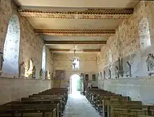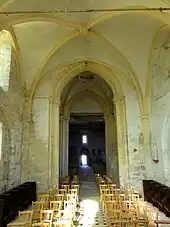 En effet, les deux petites chapelles latérales ou enfeus qui flanquent la première travée du chœur sont démolis avant la fin du Moyen Âge, et la chapelle ou l'enfeu du nord est remplacé par une chapelle plus grande servant de sacristie ; puis le croisillon sud est amputé de sa moitié méridionale lors de la construction du logis prioral, sans doute au XVIIe siècle. Enfin, la croisée du transept et le chœur sont revoûtés à la fin de la Renaissance. La modénature méplate des nervures des voûtes est caractéristique de la Renaissance, tandis que les chapiteaux évoquent déjà le style classique. Il ne peut pas être question de « voûtes d'ogives prismatiques pénétrantes » de type gothique flamboyant, comme le prétend Bernard Duahamel[6]. La raison de ce revoûtement est probablement l'effondrement de l'étage de beffroi du clocher gothique, qui a été remplacé par une construction sans caractère à l'époque moderne. D'autres travaux de remaniement interviennent encore au XIXe siècle. Ils portent notamment sur la réfection du parement extérieur du croisillon nord et son aménagement intérieur, ainsi que sur la décoration de la nef, dont la charpente en carène renversée est dissimulée par un plafond plat. Les allèges reçoivent un nouveau parement en pierre de taille, comme au Perchay. Les parties hautes des murs sont enduits et peints en faux-appareil, avec toujours les mêmes motifs réalisés au pochoir, sauf pour les ébrasements des fenêtres, où l'on voit des fleurettes. Le plafond est également enduit, et les solives sont à leur tour peintes au pochoir.