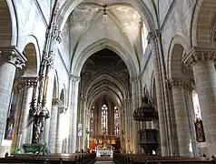 La nef, croisées de voûtes, alternance de piliers et colonnes.