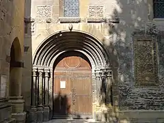 Les parties les plus anciennes de l'édifice datent du XIe siècle, on ne dispose pas de plus d'informations sur l'église primitive. Il s'agit d'éléments de style roman : les bras du transept dont les hautes absides semi-cylindriques caractéristiques sont visibles aussi bien à l'intérieur de l'église que de l'extérieur où elles sont décorées de lésènes, frises caractéristiques de l'art roman. Le portail de l'entrée sud avec sa remarquable archivolte en plein-cintre fait partie de ces éléments les plus anciens, de même que les bas-reliefs qui le surmontent.