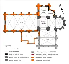 | Début de la construction | 2e quart XIIe siècle (croisillon nord et absidiole) ; années 1160-1250 (remaniement croisée du transept, chœur) | ||