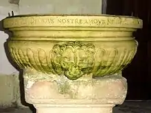 Des fonts baptismaux de 1556, seul subsiste la cuve en pierre de taille. Le pied est moderne et rapporté. La cuve est de plan circulaire et mesure 83 cm de diamètre. La bordure est profilée, du haut vers le bas, d'une plate-bande en encorbellement, et d'une scotie entre deux listels. La partie inférieure de la cuve est sculptée de godrons, ainsi que de deux têtes de lion. Le principal intérêt de l'œuvre réside de l'inscription gravée sur la plate-bande de la bordure, en une seule ligne. Sa particularité, rare à l'époque, est d'être rédigée en partie en français, en partie en latin. Elle se lit comme suit : « BON IHS FONTAINE DE VIE. DE VOVS NOSTRE AMOVR NE DEVIE. HAVRIETIS AQVAS IN GAVDIO DE FONTIBVS SALVATORIS ». Suivent le nom du prophète Isaïe en hébreu, puis en latin ; ensuite la mention du passage de l'Ancien Testament dont la phrase en latin est tirée, Ésaïe 12,3 (traduction : Vous puiserez des eaux avec joie aux sources du salut) ; et enfin la date, . — Ferdinand de Guilhermy observe qu'un bénitier en plomb de la fin du IVe siècle tiré des ruines de Carthage porte le même verset du livre d'Isaïe sur sa bordure, mais en grec[9]. La cuve est classée depuis juillet 1912. Elle souffre des importantes remontées d'humidité dans l'église. La base est très abîmée, marquée par des effritements à certains endroits et rongée par le salpêtre, et des algues vertes sont présentes sur la cuve[10].