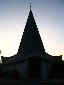 La forme de cet édifice peut évoquer la barque de Pierre, ou bien un poisson rappelant que le Christ est sauveur. Les murs sont construits en béton et le toit en bois et ardoise[8]. L'architecte Antoine Korady explique que l'église représente une rose inversée: les voutes représentent les pétales (formées de plans assemblés en paraboles hyperboliques) et la flèche représente la tige. Le plan de l'église est un poisson. Le coq de la flèche, dessiné par l'architecte, a été éxécuté par le forgeron Maurice Levasseur père et fils. Les vitraux sont l'œuvre de Jacques Loire, les sculptures de Louis Leygue et Maurice Calka[9].