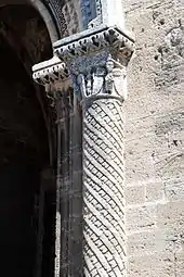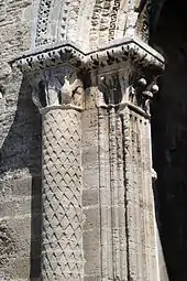 Ces colonnes présentent des cannelures variées (en zigzag, torsadées ou en losanges) et sont surmontées de chapiteaux ornés de motifs végétaux, à gauche, et d'aigles aux ailes déployées, à droite (motif déjà rencontré sur le portail méridional).