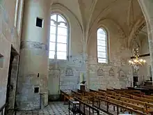 Les bases des deux piliers ne sont pas identiques. Celle du pilier entre les deux arcades se compose d'une base indépendante pour chaque ondulation, avec, du haut vers le bas, une gorge entre deux tores aplatis, puis le passage vers un plan hexagonal, et une base octogonale commune aux huit ondulations. La base du pilier sud-ouest de la croisée du transept comporte une sorte de plinthe commune aux huit renflements, puis le pilier reprend pour une courte section sa forme habituelle, avant de s'amortir sur un socle aux angles émoussés. La disparition des angles saillants indique une date de construction plus récente. Des plinthes semblables sont par exemple utilisées dans les nefs de Vauréal, avant 1530, et Précy-sur-Oise, après 1570 (en réunion avec des piliers cylindriques)[10]. L'évolution entre les deux piliers montre que la construction a progressé d'ouest en est, et qu'il ne s'agit pas d'un pastiche de la première moitié du XVIIe siècle de l'architecture flamboyante, comme l'est par exemple le transept de Saint-Germain-des-Prés[11]. — On trouve encore d'autres piliers ondulés au nord du doubleau vers le carré du transept, et au sud de l'arcade vers le croisillon sud ; ces piliers sont engagés dans les murs mais sinon analogues. Au droit des murs et dans les angles près de la façade, les supports sont plus simples, et se présentent sous la forme de piliers cylindriques engagés. Dans tous les cas, les nervures des voûtes sont pénétrantes, et il n'y a pas le moindre chapiteaux. Le profil du doubleau vers la croisée et de l'arcade vers le croisillon sud est calqué sur les grandes arcades. Les ogives et les doubleaux intermédiaires de la nef et du collatéral affectent un profil prismatique aigu, ce qui cadre mal avec la date de 1614. Il est possible que les voûtes du collatéral ont été lancées trois générations après celles de la nef, tout en imitant les dispositions rencontrées dans la nef. Les motifs des clés de voûte du collatéral sont une rosace davantage gravée que sculptée, et une croix de Malte avec une petite rosace au centre. Dans la nef, les clés de voûte restent frustes. Quant aux fenêtres, elles sont en arc brisée, et appartiennent à deux types, à savoir deux lancettes aux têtes tréflées surmontées d'un meneau simple dans la première travée, et une lancette simple dans la seconde travée, ainsi qu'en haut du mur occidental. Au nord, la lancette est nettement désaxée par rapport à l'arc formeret, et plus étroite qu'au sud. La sculpture des bases des meneaux est restée inachevée.