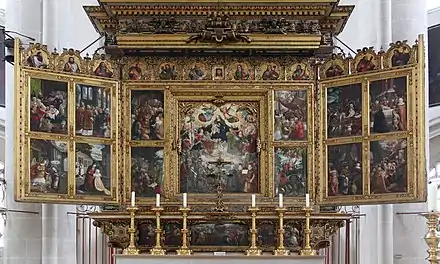 Le maître-autel, tout en couleurs, a été installé en 1572 à l'occasion du centenaire de l’université d'Ingolstadt. Il a été commissionné par le duc Albert V de Bavière. Le duc est représenté comme donateur dans le panneau central, aux couleurs blanc et bleu de la Bavière. La conception d'ensemble est de Hans Mielich ; parmi ses plus de quatre-vingt-dix tableaux, nombreux sont ceux qui représentent des scènes bibliques. Ce flot d'images doit s'opposer, dans l'idée de la Contre-Réforme, à iconoclasme calviniste qui a sévi quelques années plus tôt.